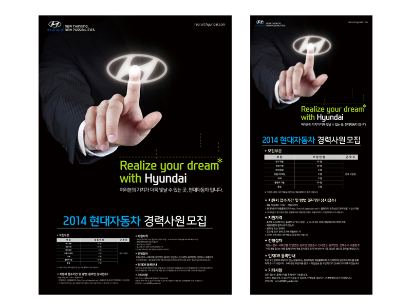 BRAND101 PORTFOLIO BRANDING / CONTENTS / DESIGN 광고디자인 현대자동차 경력사원 모집 포스터/웹광고 페이지 정보 작성자 브랜드101 댓글 0건 조회 29회 작성일 26-01-03 10:56 목록 본문 Realize Your Dream이라는 헤드라인으로 현대자동차와 당신의 꿈을 현실화하라는 메세지. 전체적인 톤앤매너는 권위를 느끼게하며 투명 터치패드를 활용 현대적이고 디지털 이미지를 강조하였다. 이전글현대자동차 신입사원 공채 소개서 H-BOOK 1st Edition 26.01.03 다음글LG이노텍 26.01.03 댓글 0 댓글목록 등록된 댓글이 없습니다.