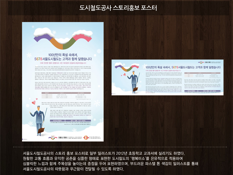 BRAND101 PORTFOLIO BRANDING / CONTENTS / DESIGN 광고디자인 도시철도공사 캠페인 포스터 페이지 정보 작성자 브랜드101 댓글 0건 조회 43회 작성일 26-01-04 12:53 목록 본문 서울도시철도공사의 스토리 홍보 포스터로 일부 일러스트가 2012년 초등학교 교과서에 실리기도 하였다. 새로운 도시 지하철문화를 만들기 위한 의도로 원활한 교통 흐름과 유익한 공존을 심플한 형태로 표현한 도시철도의 ‘행복미소’를 은유적으로 적용하여 심볼릭한 느낌과 함께 주목성을 높이는데 중점을 두어 표현하였으며, 부드러운 파스텔 톤 색감의 일러스트를 통해 서울도시철도공사의 따뜻함과 푸근함이 전달될 수 있도록 하였다. 다음글삼우설계 기업브로셔 26.01.04 댓글 0 댓글목록 등록된 댓글이 없습니다.